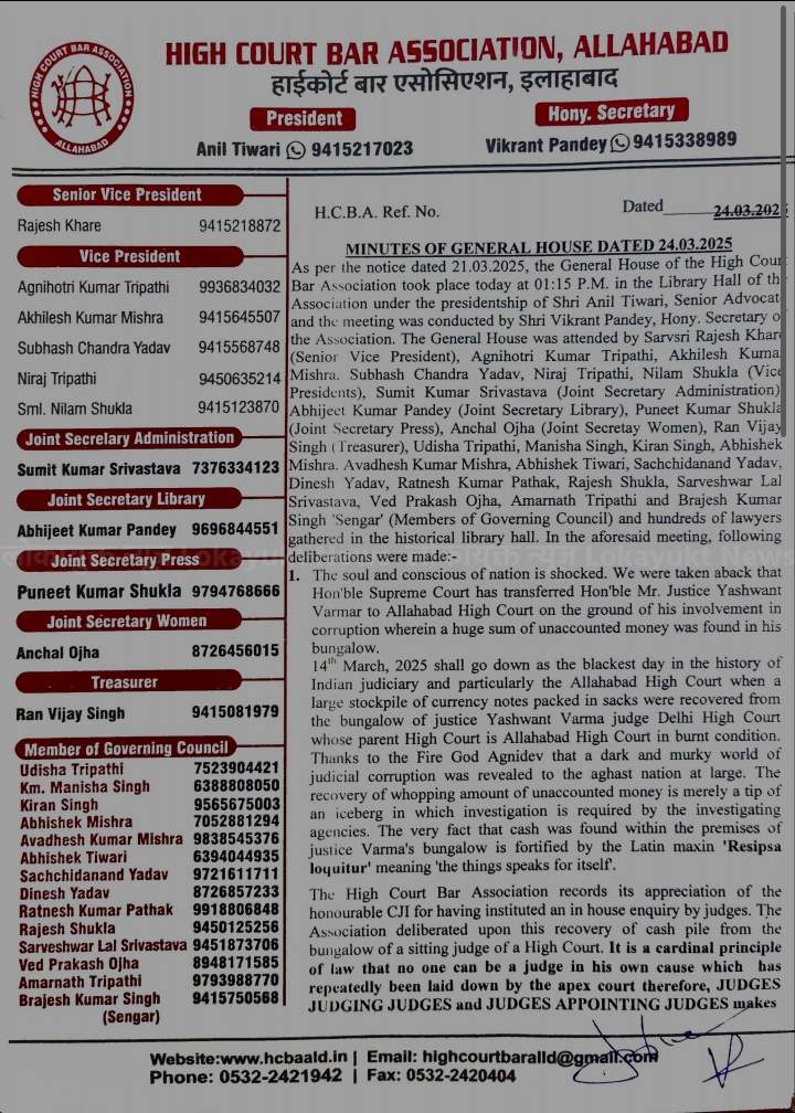 उत्तर प्रदेश के प्रयागराज इलाहाबाद हाईकोर्ट बार एसोसिएशन की जनरल हाउस मीटिंग में आज कई अहम प्रस्ताव पारित किए गए। मीटिंग में जस्टिस यशवंत वर्मा पर लगे आरोपों की निष्पक्ष और गहन जांच की मांग की गई।