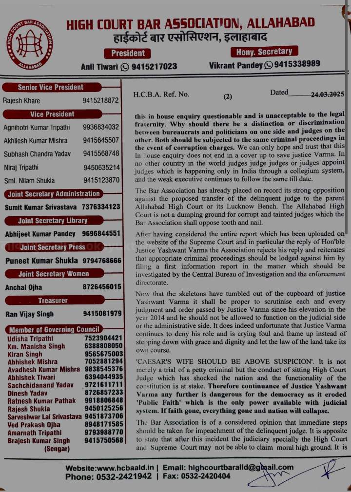 विरोध की घोषणा : यदि जस्टिस यशवंत वर्मा इलाहाबाद हाईकोर्ट में आते हैं, तो बार एसोसिएशन विरोध प्रदर्शन करेगा।